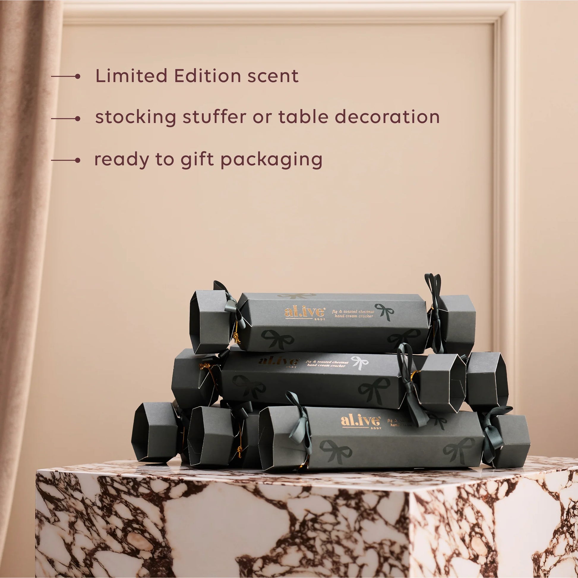 This Limited Edition Hand Cream Cracker Set in Fig & Toasted Chestnut is a generous collection of six luxurious hand creams, each beautifully presented in festive cracker packaging that doubles as table décor.